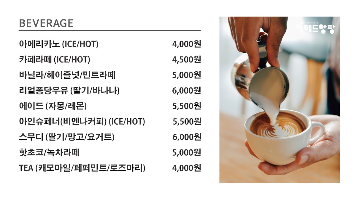 The menu offers a selection focused primarily on beverages and light refreshments suitable for coffee breaks and casual visits. Visitors can expect an assortment of coffee and non-coffee drinks, including smoothies, as noted by customer experiences. The menu structure supports quick orders and relaxed consumption, making it appropriate for individuals or families looking for light meals or drinks while accompanying children.